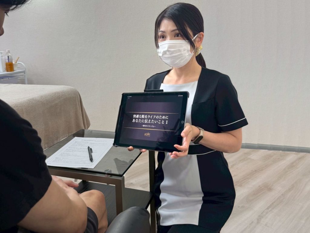 メンズ脱毛サロンADIREでは、初めての方でもリラックスして受けられるよう、体勢や照射ペースにも配慮しておりますので、心配なくお任せください。